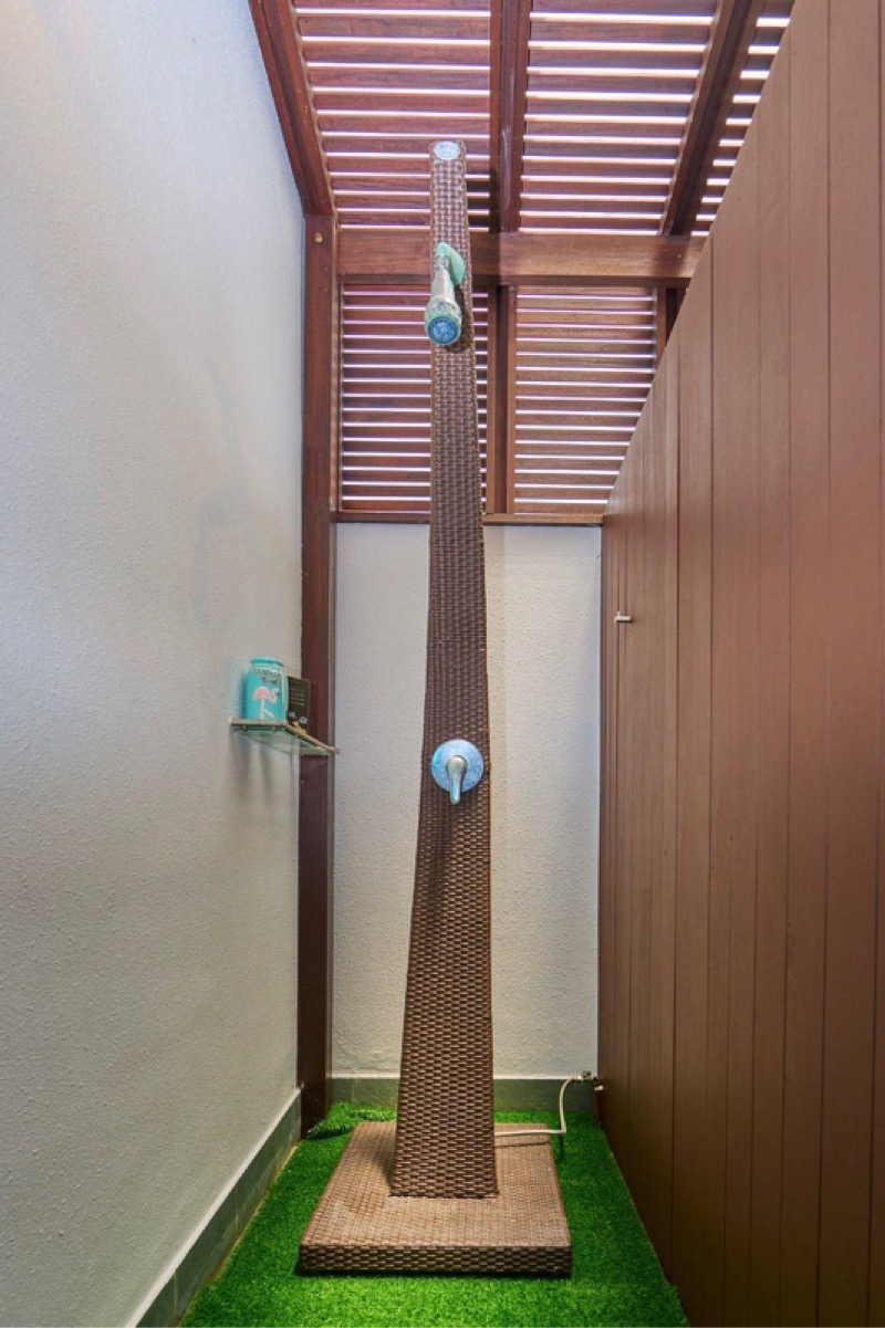 Elevated Outdoor Sanctuary: A private, air-conditioned sky garden and canopied lounge featuring a luxurious outdoor rain shower and coastal views.
